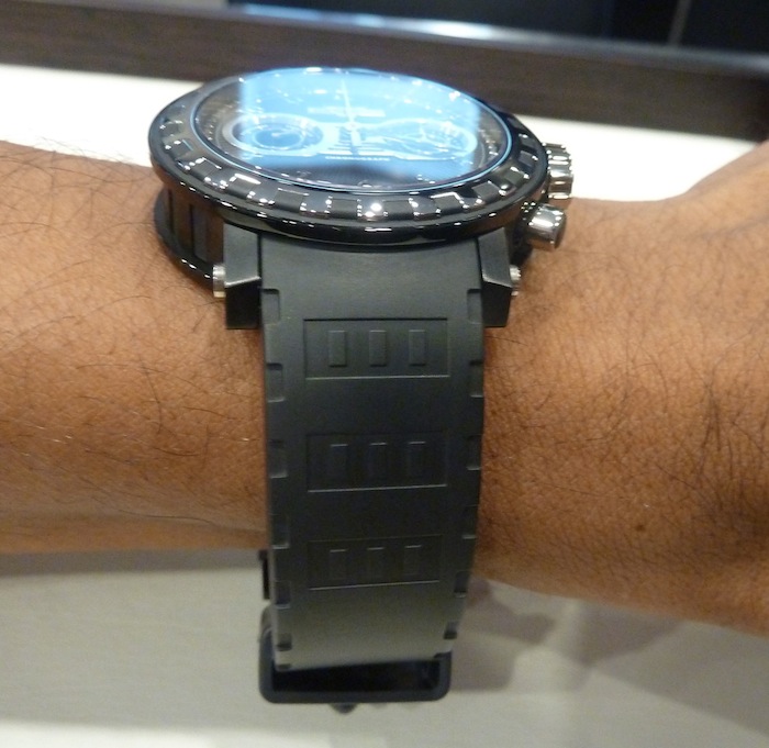 My first impressions of the Academia BC are that it’s modestly proportioned (44mm x 13.35mm) in comparison to other DeWitt models. The watch itself was very comfortable to wear. This is probably down to lightweight Grade 5 Titanium (black PVD coated) case & the intuitive styling. For the short amount of time I wore the actual watch it was definitely a pleasurable experience. On that basis I feel this piece would be practical to wear for any occasion. The version I tried on came with a matt black rubber strap that in my opinion offered flexibility. I also feel it complimented the sporty design of the watch. That’s just my personal preference & it’s fair to say a lot of people might prefer the matt black alligator alternative.