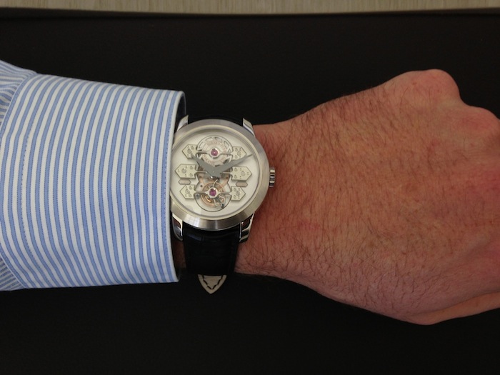 The origin of the Three Bridge Tourbillon dates back over 125 years to 1894. In 1889 this innovation won a gold medal at the Paris International Exhibition. The current version is encapsulated in a modest 41mm diameter (white or pink) gold case. These classical dimensions will definitely appeal to the serious collector. I have reviewed quite a few watches of this size and have found them easy to wear. On that basis I suspect this beautiful timepiece would sit comfortably on the wrist. Realistically a watch of this caliber would only be worn for very special occasions. I think this timepiece would look wonderful with a formal dinner suit.