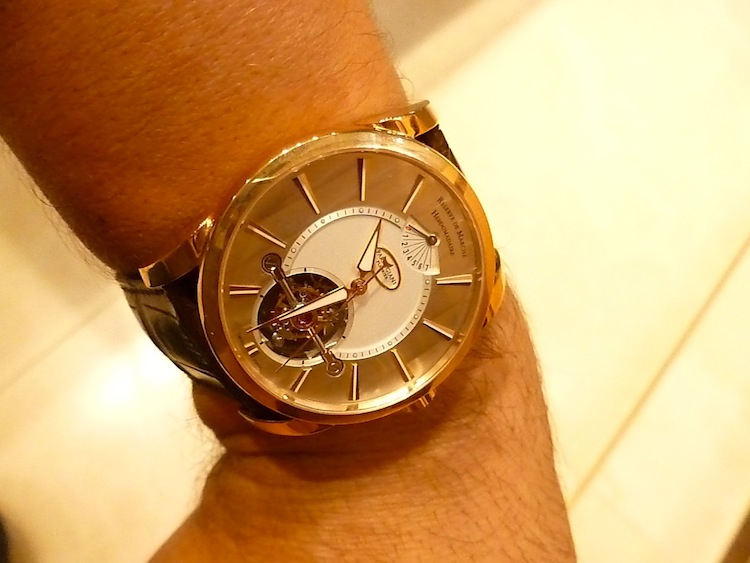 In contrast to the contemporary styling of the Bugatti watch the Tonda Tourbillon exudes classical charm. The silver dial is decorated with a sublime Côtes de Genève pattern on the outer ring and a delicate Velvet finish in the centre. This works in graceful harmony with the Rose gold plated indexes and sophisticated delta-shaped hour/minute hands. Overall the composition is understated which perfectly suits the style of the watch. Other key design elements are the power reserve indicator and the imposing tourbillon positioned at 6 o’clock.