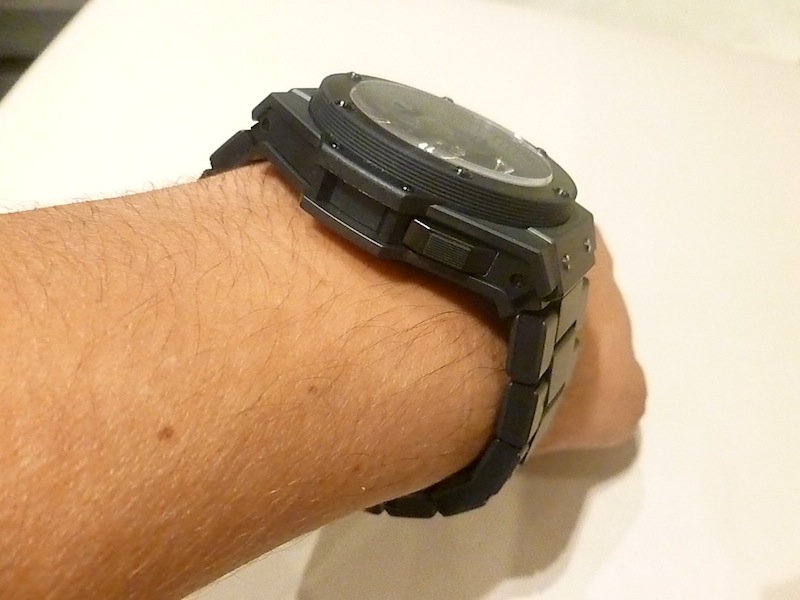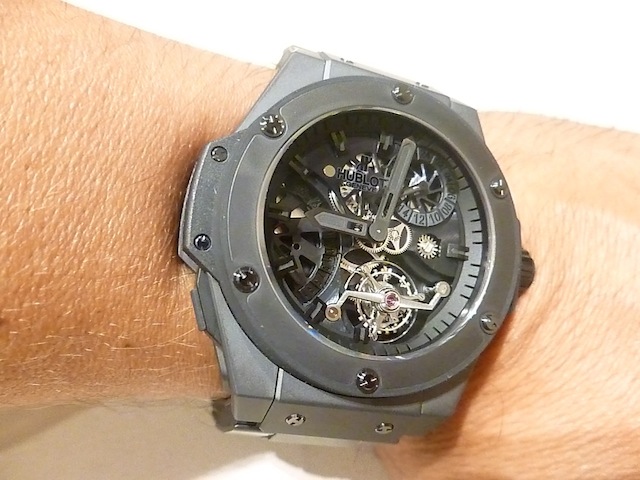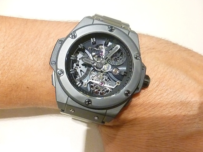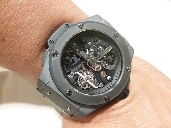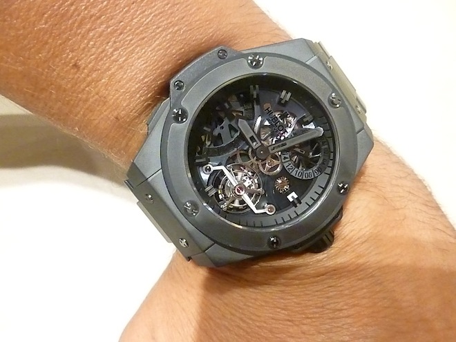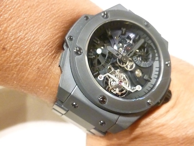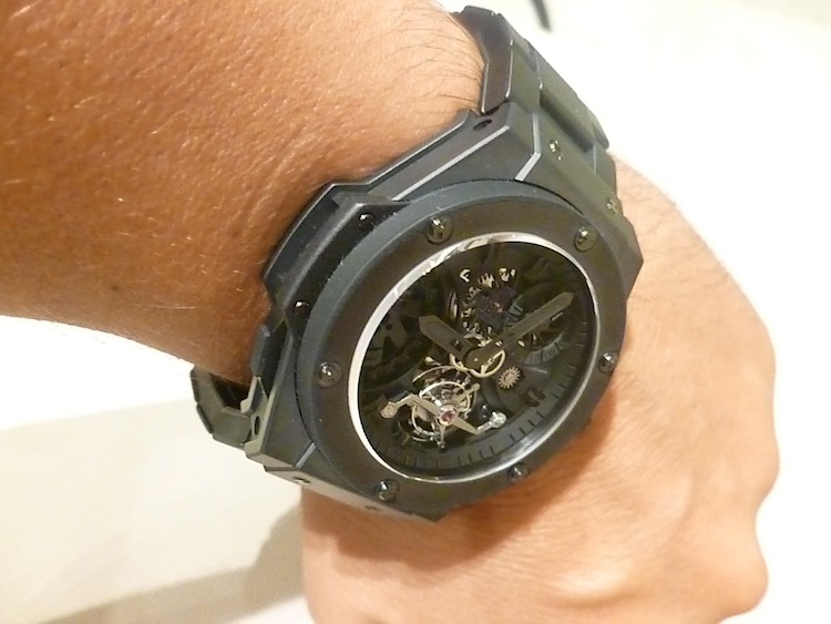 The King Power Tourbillon I tried on was equipped with a customised black ceramic bracelet instead of the normal rubber strap. Priced for the serious collector at: $200,000. (Available to purchase at: http://www.jfarrenprice.com.au).
