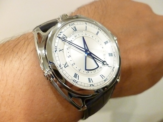 Aesthetically the DB27 Titan Hawk has a more classical façade than the majority of De-Bethune’s other models. Ultimately this should appeal to an audience with more traditional tastes. The microlight silver toned dial is understated and has a high quality appearance. A raised chapter ring displays Roman numeral hours and Arabic number minutes. I love the open worked blue steel hour/minutes hands and central date marker. Overall I feel the composition has been thoughtfully considered and executed to perfection.