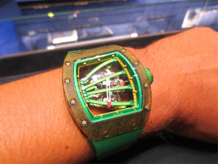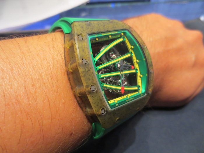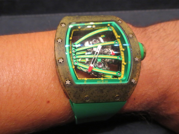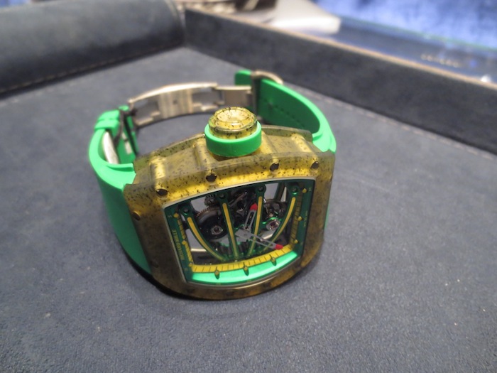 The RM-59-01 Tourbillon Yohan Blake is equipped with a vibrant green rubber strap. For similar exclusive timepieces visit Malmaison in Singapore (http://www.thehourglass.com). Priced for the discerning collector at: $620,000.