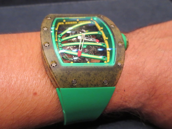 Visually the RM-59-01 Tourbillon Yohan Blake has got a really radical appearance that will only appeal to a very small demographic. What makes this watch so distinctive is the translucent bright green textured composite carbon tonneau shape case. The colours of the Jamaican flag inspired this unusual feature. I absolutely love the wonderful skeleton dial showcasing the brilliant mechanical elements of the watch including the tourbillon. Other intricate details include a yellow/green chapter ring, open worked hour/minute hands, bezel with 20 spline screws and trademark-oversized crown. Overall I feel the minimalistic composition has an industrial feel and the finishing is unsurpassed.