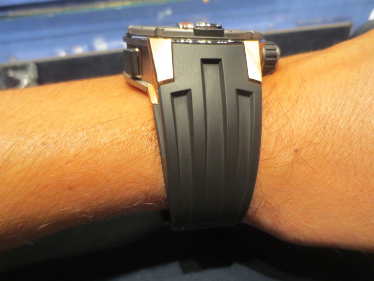 In contrast to the radical RM-59-01 Tourbillon Yohan Blake the RM-025 has a more conventional appearance. With a case size measuring 50.70 mm x 19.10 mm (excluding the crown) it also felt a lot chunkier than the RM-59-01. Personally I see that as a huge positive as I absolutely love large watches. Nevertheless it did feel lightweight to wear and sat comfortably on my wrist. Primarily this is down to the stylish design of the watch and choice of titanium with 18-karat red gold lugs.