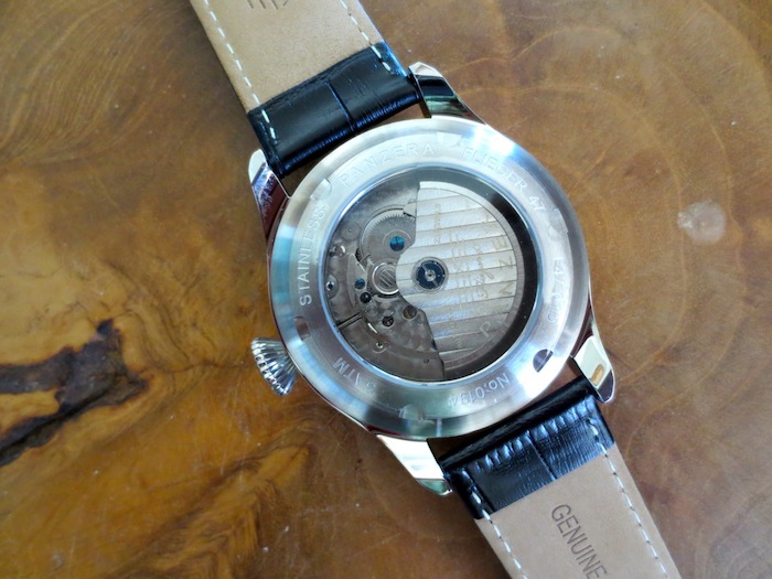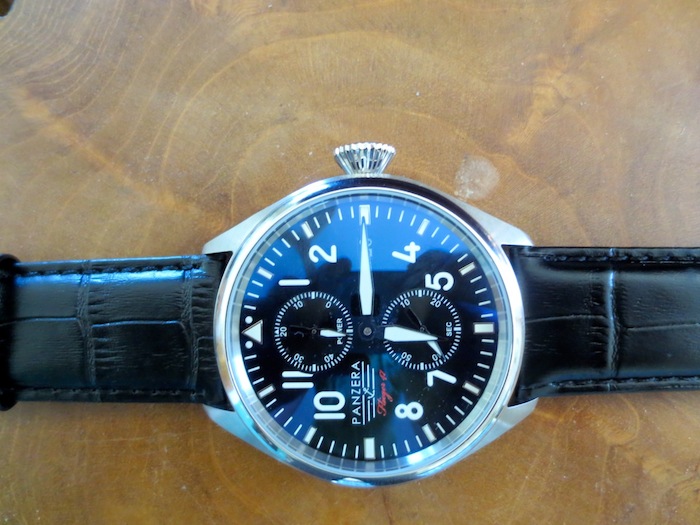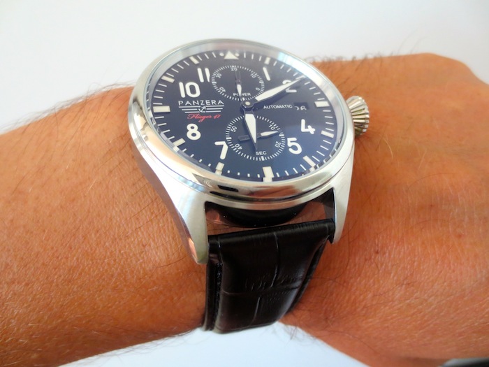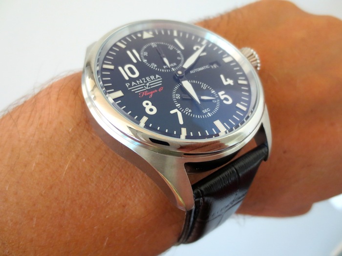Presently the company has released two collections called the Breuer Bauhaus and the Flieger. The timepiece I chose to test is the distinctive Flieger F47-01D Arado. On first inspection the watch looks reasonably well made, especially for a suggested retail price of less than $500. To keep the costs down Panzera sub contract the assembly of their watches to a German company with factories located in China. Dimensionally the timepiece measures 47mm x 11mm (excluding the crown) which should appeal a broad range of buyers. By no means is this the lightest watch I have ever worn (124 grams) but generally I found it was pleasurable to wear.