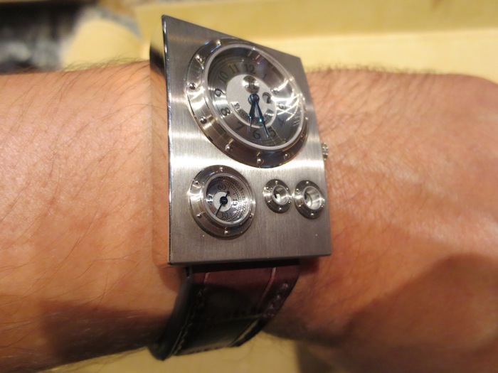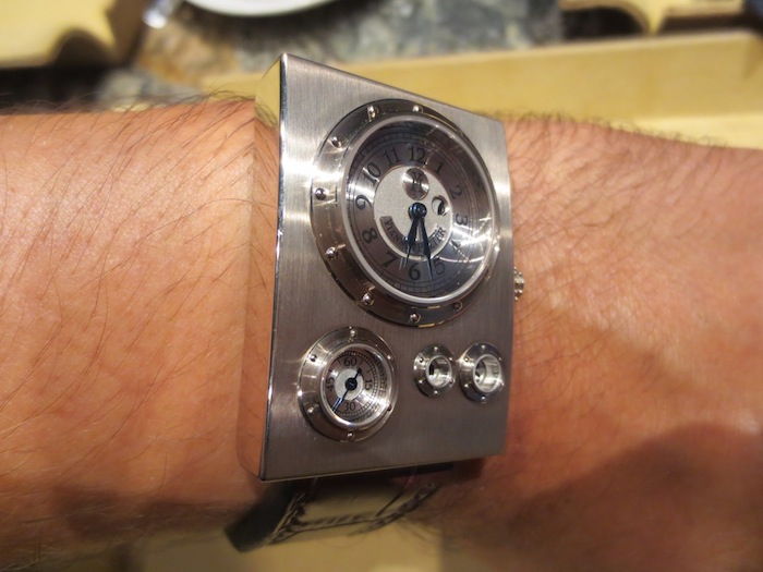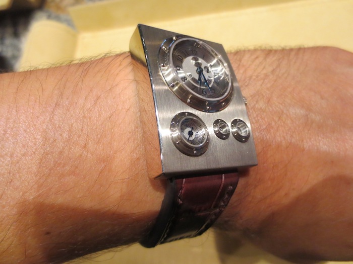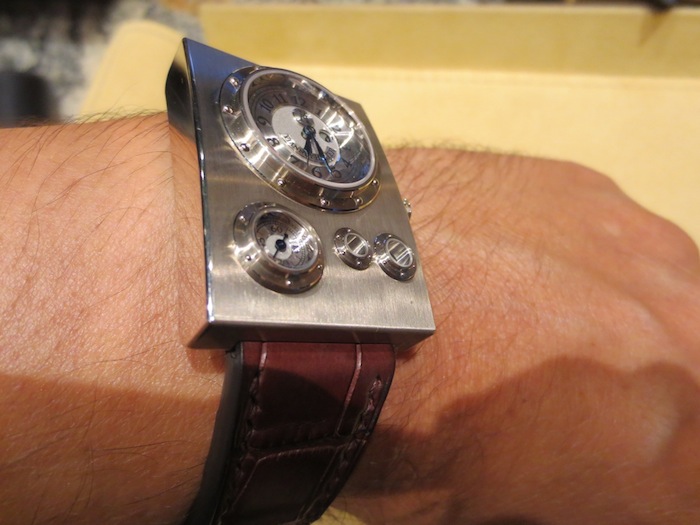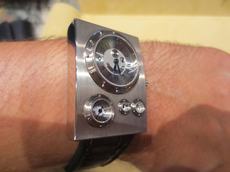 Aesthetically all of Vianney Halter’s timepieces are created to make a bold statement and the Trio Grande Date is no exception. The world of Jules Verne and sea travels inspired the design of the watch. By chance (on the same Singapore trip) I met a serious watch collector who was privileged enough to own a Harry Winston Opus 3. This amazing timepiece was designed by Vianney Halter and was awarded the Grand Prix d’Horlogerie de Genève (Innovation prize) in 2003. Even though these two watches have their own unique characteristics I feel they have strong resemblance. I love Steampunk timepieces especially ones with porthole style windows. Two other great examples I have personally written about are the Polyphemos by Angular Momentum and Thomas Prescher’s sensational Nemo Captain.