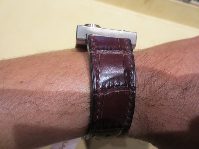 The Trio Grande Date (as tested) has a hand stitched brown alligator strap with matching 18-karat white gold buckle. Priced at: 123,000 CHF (approximately $122,315).