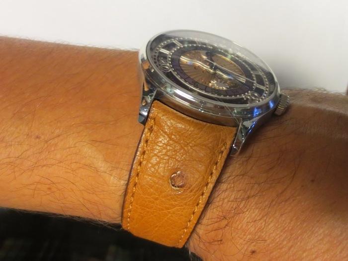 The Babylonian has a hand crafted tan colour Ostrich strap with matching stainless steel buckle. Priced at: $2,835
