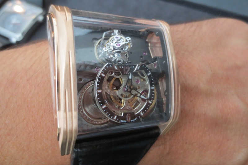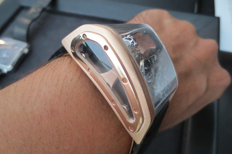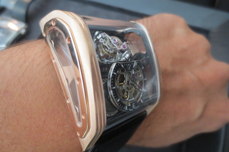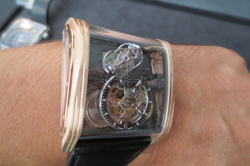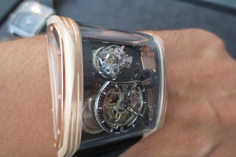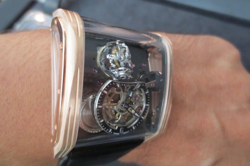 Previously I have written numerous articles about Cabestan but I have never actually tried on any of their timepieces. Fortunately a few weeks ago at Baselworld this all changed with the unveiling of their new Triple Axis Tourbillon. Even though I had arranged a meeting in advance with owner Lionel Betoux and Marketing Director Carine Mason the schedule seemed to disappear out of the window. Unbelievably a few journalists had descended on the booth at the same time and all wanted to get a wrist shot of this watch. For that reason I only had access to the timepiece for a few minutes. Generally for a watch of this size (50.25 mm x 45.50 mm x 22.30 mm) I found it comfortable to wear and didn’t experience any friction from the lugs. Primarily this is down to the ergonomic case design and choice of luxurious 18-karat rose gold in production.