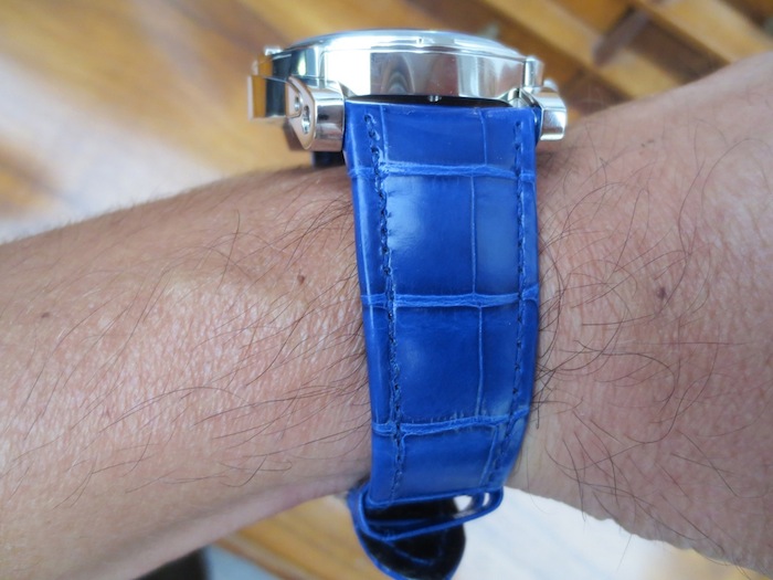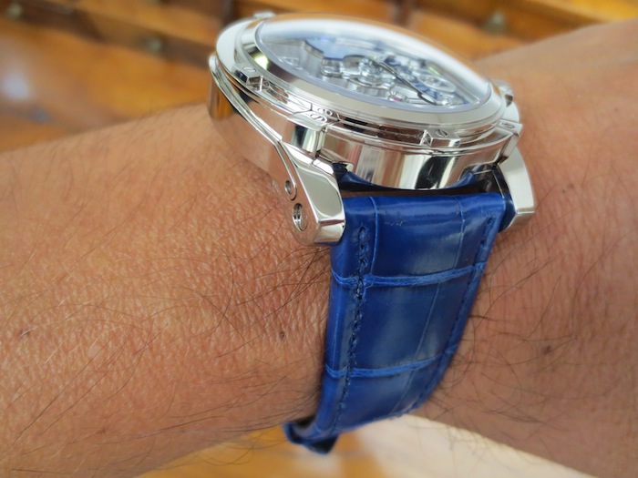 The Derrick Gaz Tourbillon (as tested) has a hand crafted blue alligator strap with matching white gold folding clasp. Priced for the connoisseur at: CHF 280,000 (approximately $293,191).