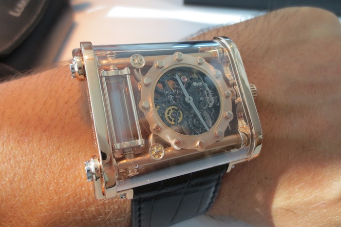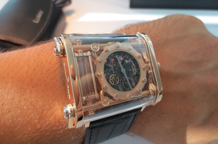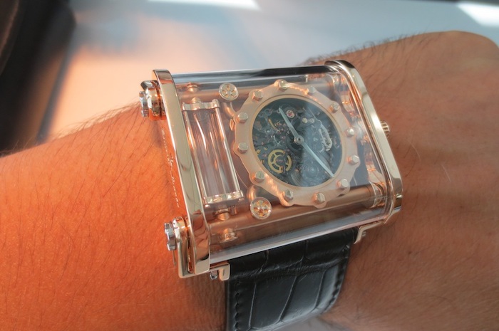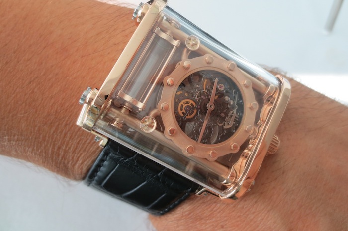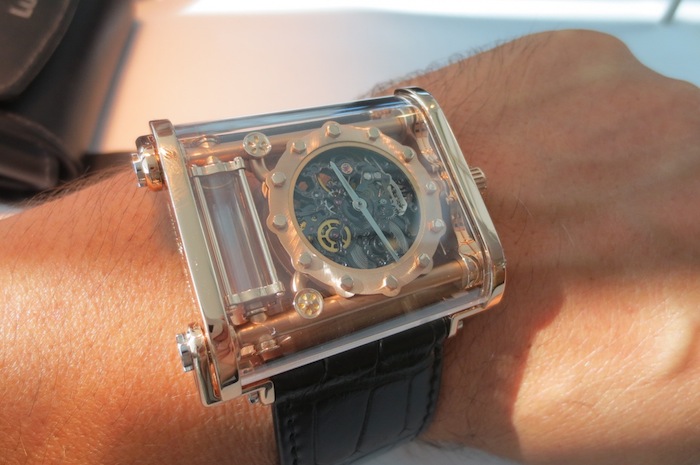Visually the watch has a very bold and distinctive appearance. Even though the styling is completely original it does remind me a tiny bit of the Triple Axis Tourbillon by Cabestan. That is probably because both watches incorporate a lot of sapphire glass into their designs. The general layout of pipelines and oil is also similar to the theme illustrated in Louis Moinet’s wonderful Derrick Gaz Tourbillon. Nevertheless the Petroleum has a more Steampunkesque façade than the Triple Axis Tourbillon and Derrick Gaz Tourbillon. What makes this timepiece so special is the astonishing level of detail. From speaking in depth with Ollivier Savelli it is clear that he is an absolute perfectionist. Overall the industrial composition is cohesive and the finishing is first rate.