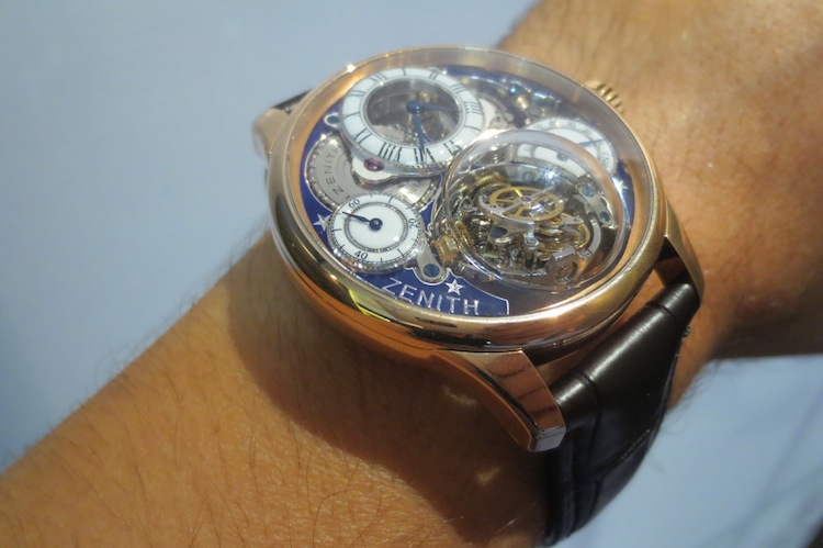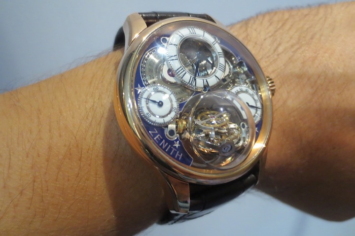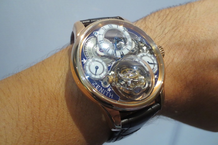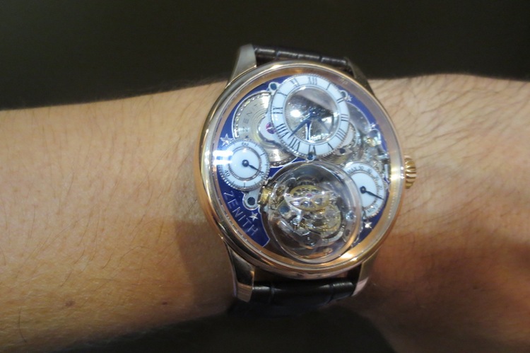 Even though I tried on several superb watches from Zenith the most impressive by far was the phenomenal Academy Christophe Colomb Hurricane Grand Voyage II. With a luxurious 18-karat rose gold case measuring 45mm x 14.635 mm (increasing to 22mm with the domed sapphire crystal) the watch should appeal to serious collectors. Due to time restrictions I only had the pleasure of wearing this wonderful watch for about five minutes. However within that timescale it gave me an accurate impression of how confortable the piece felt on the wrist. Realistically this timepiece would be reserved for extra special occasions and not for every day usage.
