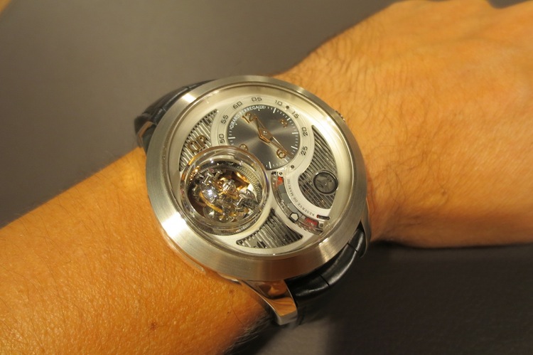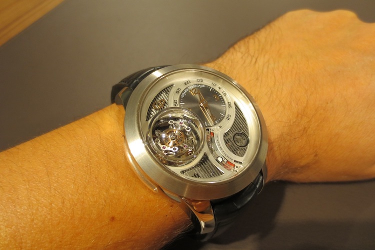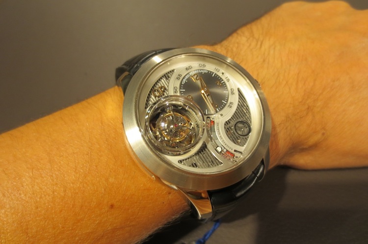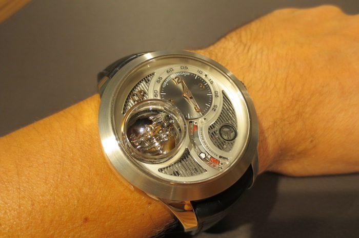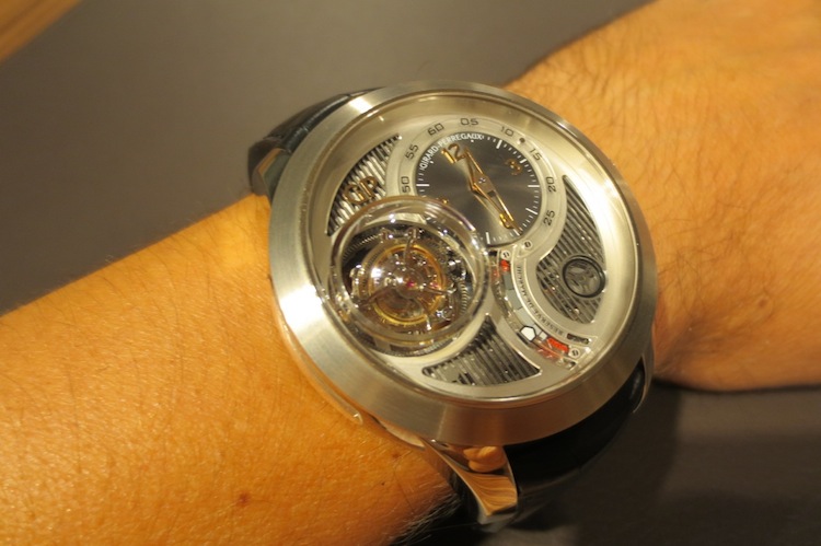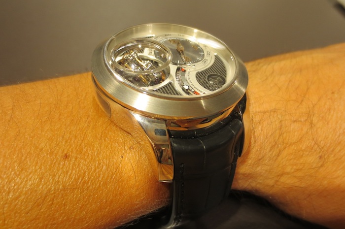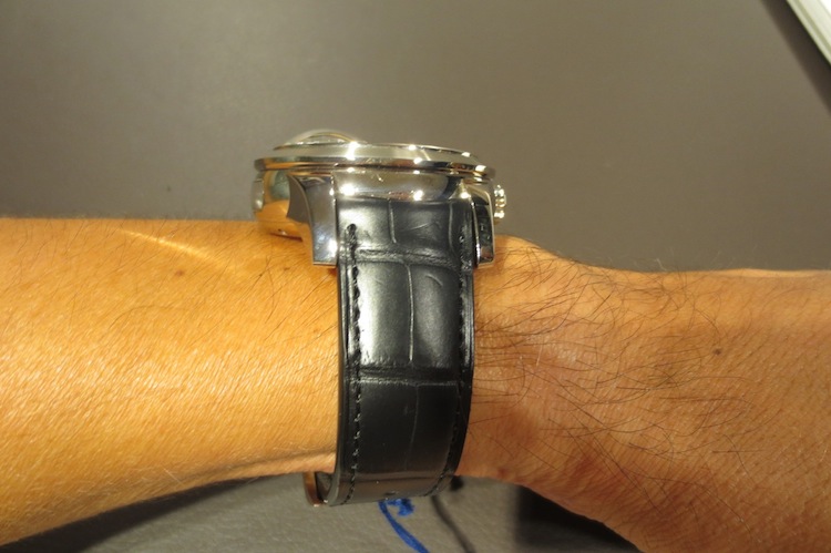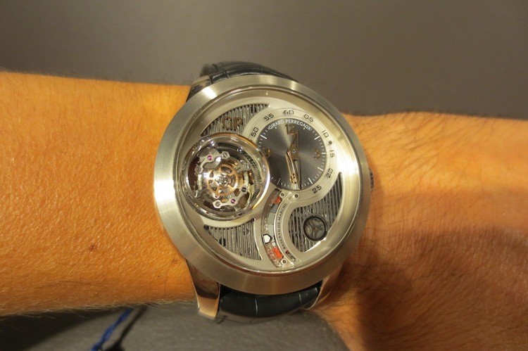 Prior to attending Baselworld my primary contact at Girard Perregaux had always been with dynamic marketing director Xavier Markl. For that reason I was really excited about meeting him in person. In the interim period he left the company (I am still unsure why) and so I was assisted by one of his colleagues. Fortunately I still got the opportunity to try on a range of exquisite timepieces including the extraordinary Tri-Axial Tourbillon. With a case measuring 48mm x 16.83mm (excluding the crown) this is definitely one of the brands largest watches to date. I love these mammoth proportions and feel they will certainly appeal to more adventurous collectors. Generally the timepiece sat comfortably on my wrist and for the short time I actually wore it, I didn’t experience any chaffing. Ultimately this is down to the ergonomic round case design and choice of luxurious 18-karat white gold in production.