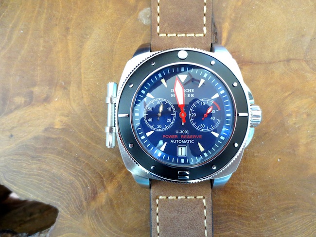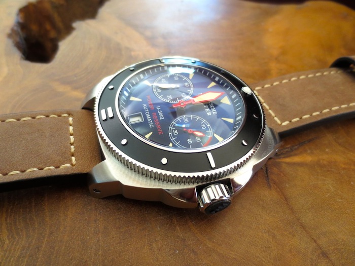 Recently Deutsche Master published images on Facebook page of a new collection of watches called the Wolf Pack, which look very interesting. The model I opted to review is the U-3001 Automatic Power Reserve. On first inspection the watch is noticeably larger than the Panzer V and has a diameter of 48m (excluding the crown and detachable emergency tool). These proportions should appeal to predominantly male buyers although I would never rule out the unisex market. Generally for a steel watch of this size it felt comfortable and I didn’t experience any friction. Certainly it could be worn on a daily basis but you are aware of its presence.