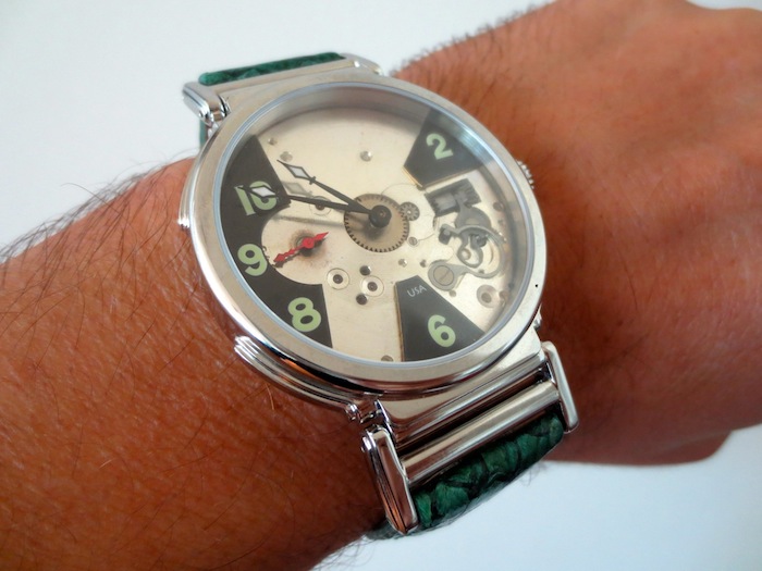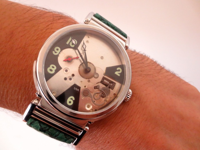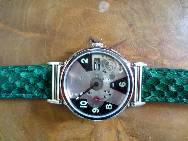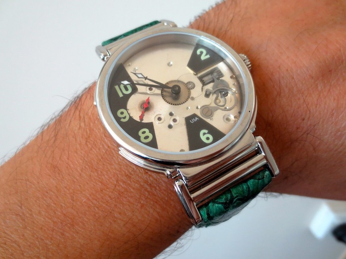 A lot of the time Richard will post images of experimental timepieces he has made. Ultimately he says that it is one of the perks of owing your own watch company. The DuoFace Spaceview is one of his more eclectic designs and certainly is a favourite of mine. What makes this timepiece so unique is the deconstructed black dial with exposed elements of the movement. This fragmented façade gives the watch a really cool industrial appearance. Other details include delicate black Cathedral style hands and a small red second hand. There is also the option to reverse this watch and display the movement face up.
