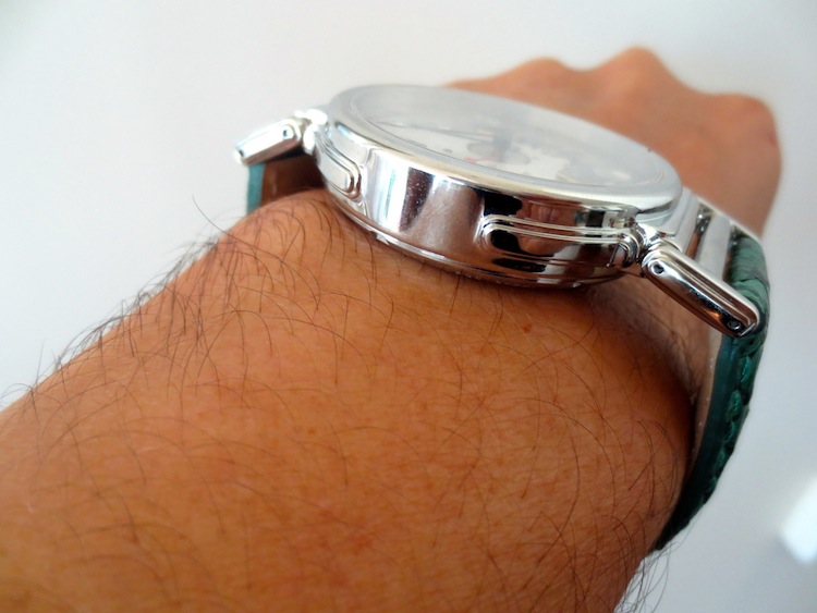 Back in February I was fortunate to review a fantastic RPaige DuoFace with an exquisite “Art Nouveau” engraved gold Waltham dial. Fortunately I have now got access to another unique piece, which actually was made by Richard purely as a prototype. Within this range all the cases are the same size and measure 44mm x 57mm x 12mm. I have to say this watch is very pleasurable to wear and I have not experienced any digging from the lugs or crown. For that reason I feel it would definitely be a practical option for most occasions (with the exception of extreme sports or deep sea diving).